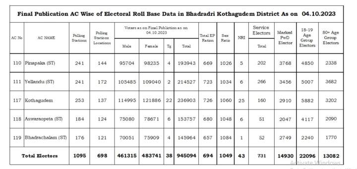 ఓటరు తుది జాబితాను బుధవారం జిల్లా కలెక్టర్ డాక్టర్ ప్రియాంక అల విడుదల చేశారు. రాష్ట్రంలో అసెంబ్లీ ఎన్నికల నేపథ్యంలో ఎన్నికల సంఘం ప్రకటించిన ప్రత్యేక ఓటరు జాబితా సవరణ-2 ప్రణాళిక పూర్తి అయ్యిందని చెప్పారు. పోలింగ్ కేంద్రాల గుర్తింపు నూతన పోలింగ్ కేంద్రాల ఏర్పాటుతో పాటు ఓటరు జాబితా సవరణ ముసాయిదా ఓటరు జాబితా విడుదల జాబితాలపై అభ్యంతరాల స్వీకరణ ప్రత్యేకంగా ఓటు నమోదుకు శిభిరాల నిర్వహణ ఓటు నమోదు, తొలగింపులు మార్పులకు దరఖాస్తులు స్వీకరణ వంటి కార్యక్రమాలు నిర్వహించామని చెప్పారు. జిల్లా వ్యాప్తంగా జిల్లాలోని ఐదు నియోజకవర్గాలలో గత నెల 19వ తేదీ వరకు మొత్తం 68703 దరఖాస్తులు రాగా క్షేత్రస్థాయిలో విచారణ నిర్వహించి అంతర్జాలంలో నిక్షిప్తం చేసినట్లు చెప్పారు. దాని ఆధారంగా తుది ఓటరు జాభితాను రూపొందించామని చెప్పారు. జిల్లాలోని ఐదు నియోజకర్గాలలోని 1095 పోలింగ్ కేంద్రాల్లో 945094 మంది ఓటర్లున్నట్లు చెప్పారు. వీరిలో 461315 మంది పురుషులు, 483741 మంది మహిళలు, 38 మంది ట్రాన్స్ జండర్లు ఉన్నట్లు చెప్పారు. ఓటరు జాభితాలో 14130 మంది దివ్యాంగులు, 22096 మంది 18-19 వయస్సు గ్రూపు వారు, 13082 మంది 80 సంవత్సరాలు పైబడిన వయోవృద్ధులను గుర్తించినట్లు చెప్పారు. ఎన్ ఆర్ ఐలు 43 మంది 731 సర్వీస్ ఓటర్లున్న ఉన్నట్లు చెప్పారు. ప్రత్యేక ఓటరు నమోదు కార్యక్రమంలో భాగస్వాములైన ప్రతి ఒక్కరిని కలెక్టర్ ప్రత్యేకంగా అభినందించారు.
