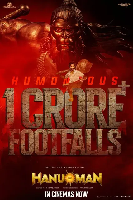 ప్రశాంత్ వర్మ దర్శకత్వంలో తేజ సజ్జా హీరోగా తెరకెక్కిన చిత్రం ‘హనుమాన్’. చిన్న సినిమాగా విడుదలైన ఈ మూవీ మొదటి రోజు నుంచే రికార్డులు సృష్టిస్తోంది. తాజాగా మరో రికార్డు సాధించింది. ప్రపంచవ్యాప్తంగా ఇప్పటివరకు ఈ సినిమాను కోటి మందికి పైగా వీక్షించినట్లు తెలుస్తోంది. కాగా, సౌత్ ఇండియా నుంచి బహుబలి, బహుబలి-2, కేజీఎఫ్-2, ఆర్ఆర్ఆర్, రోబో 2.0, ఇండియన్, యానిమల్ తదితర చిత్రాలు 3 కోట్లకు పైగా ఫుట్ ఫాల్స్ను సాధించాయి.